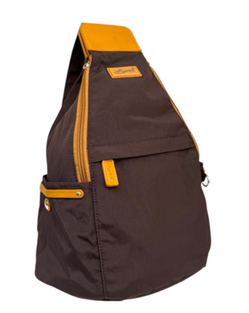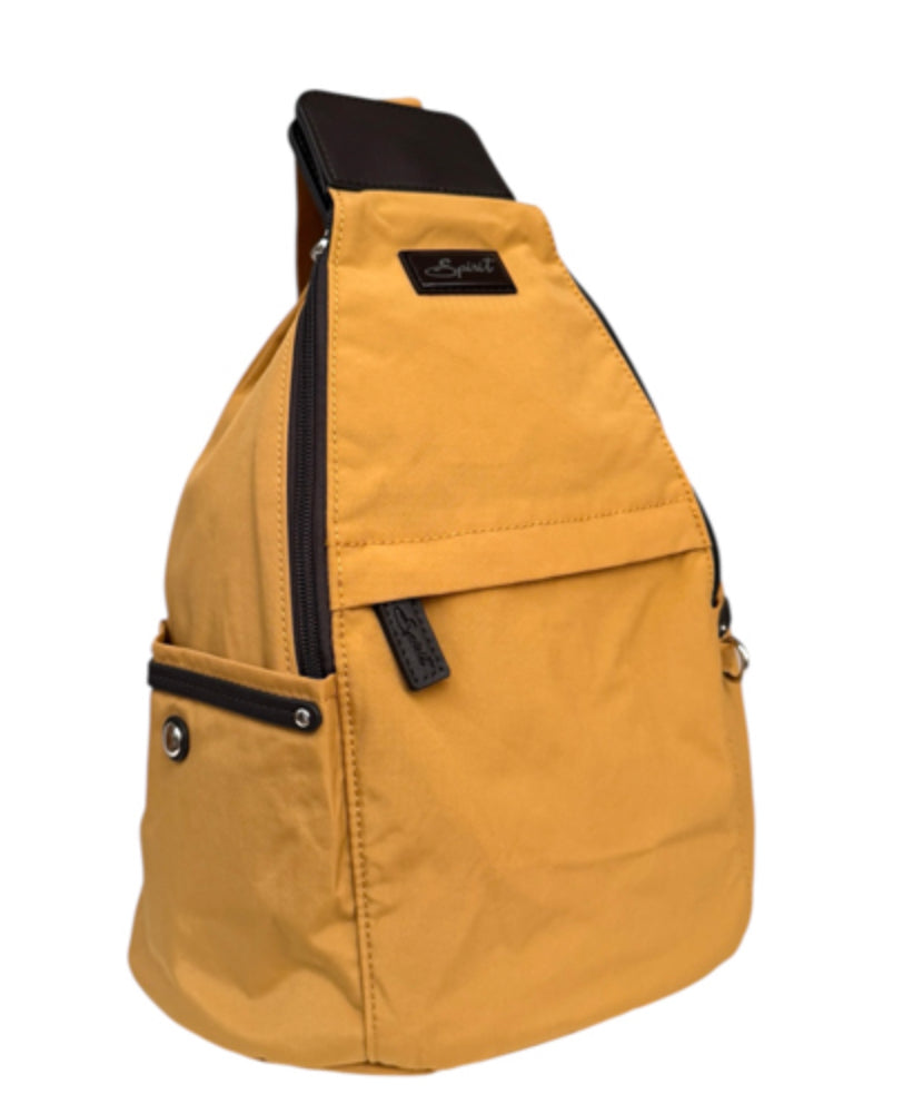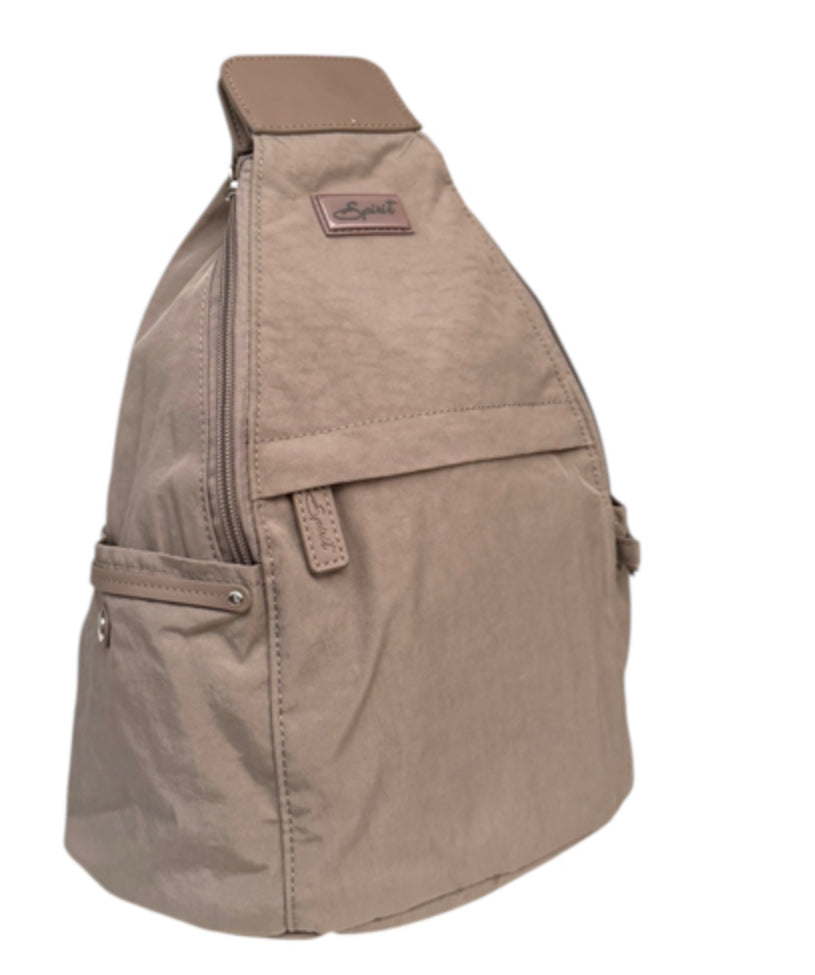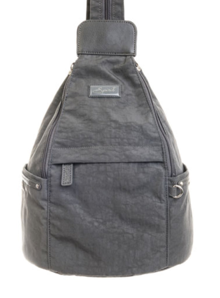 Spirit Rucksack. Made from a Lightweight, Hard Wearing Nylon. Rucksack Shoulder Straps can be zipped together to allow bag to be worn over shoulder. Large Main Compartment. Zipped Pockets Front & Back. Pouch Pockets on the Sides. Fully Lined. Dimensions: 27cm x 16cm x 37cm. |